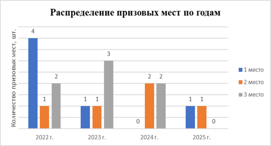 За представленные работы участникам присуждено 18 призовых мест. На рисунке 2 приведено распределение количества призовых мест по годам.