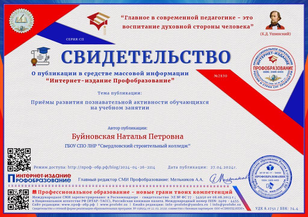 2. Документы подтверждающие деятельность участника в СМИ интернет- издательства «Профобразования».