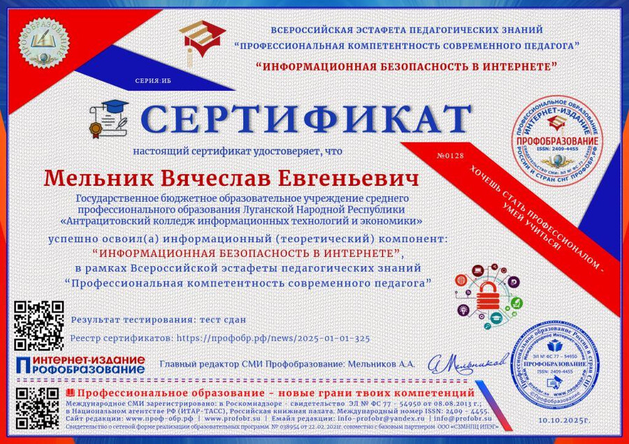 После прохождения теста, вы можете заказать сертификат об успешном освоении теоретического компонента на знание информационной безопасности в интернете.