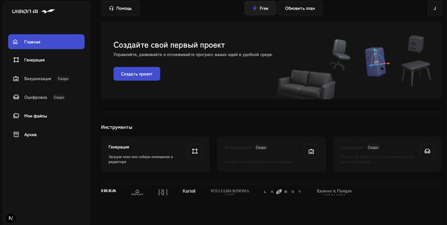 Сегодня Vision AI работает в браузере и объединяет три ключевые функции: «Генерация» автоматически создает 3D-сцену, расставляет мебель и материалы и формирует смету из реальных товаров; «Визуализация» делает изображения фотореалистичными и позволяет получать новые варианты по фото или текстовому описанию; «Оцифровка» превращает фотографии и описания в готовые 3D-модели.